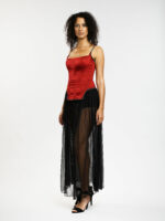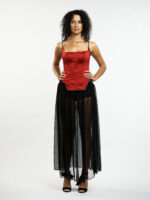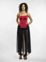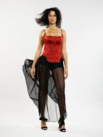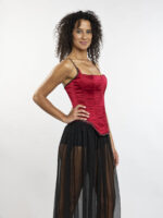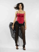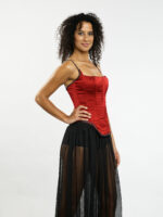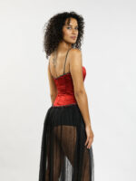 Ce corset rouge flamboyant sculpte la silhouette avec une élégance audacieuse. Ses lignes structurées mettent en valeur la taille, tandis que les bretelles et le bas, ornés de détails délicats évoquant un collier précieux, ajoutent une touche de raffinement inattendu. Cette pièce captivante est idéale pour celles qui souhaitent affirmer leur féminité avec une allure à la fois forte et sophistiquée.