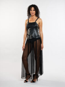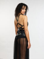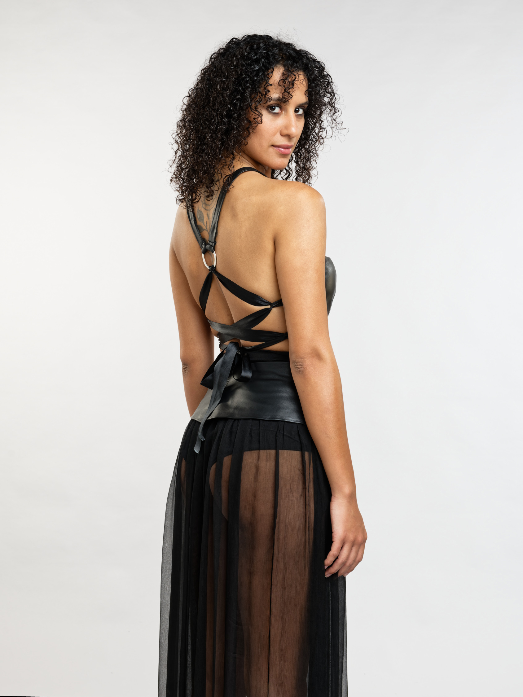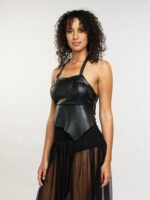 Élégant et audacieux, ce top en cuir noir allie sophistication et style. Avec ses bretelles croisées à l'arrière et sa coupe ajustée, il sublime votre silhouette pour un look raffiné. Parfait pour les occasions spéciales, ce top est idéal pour celles qui cherchent à allier glamour et confiance.