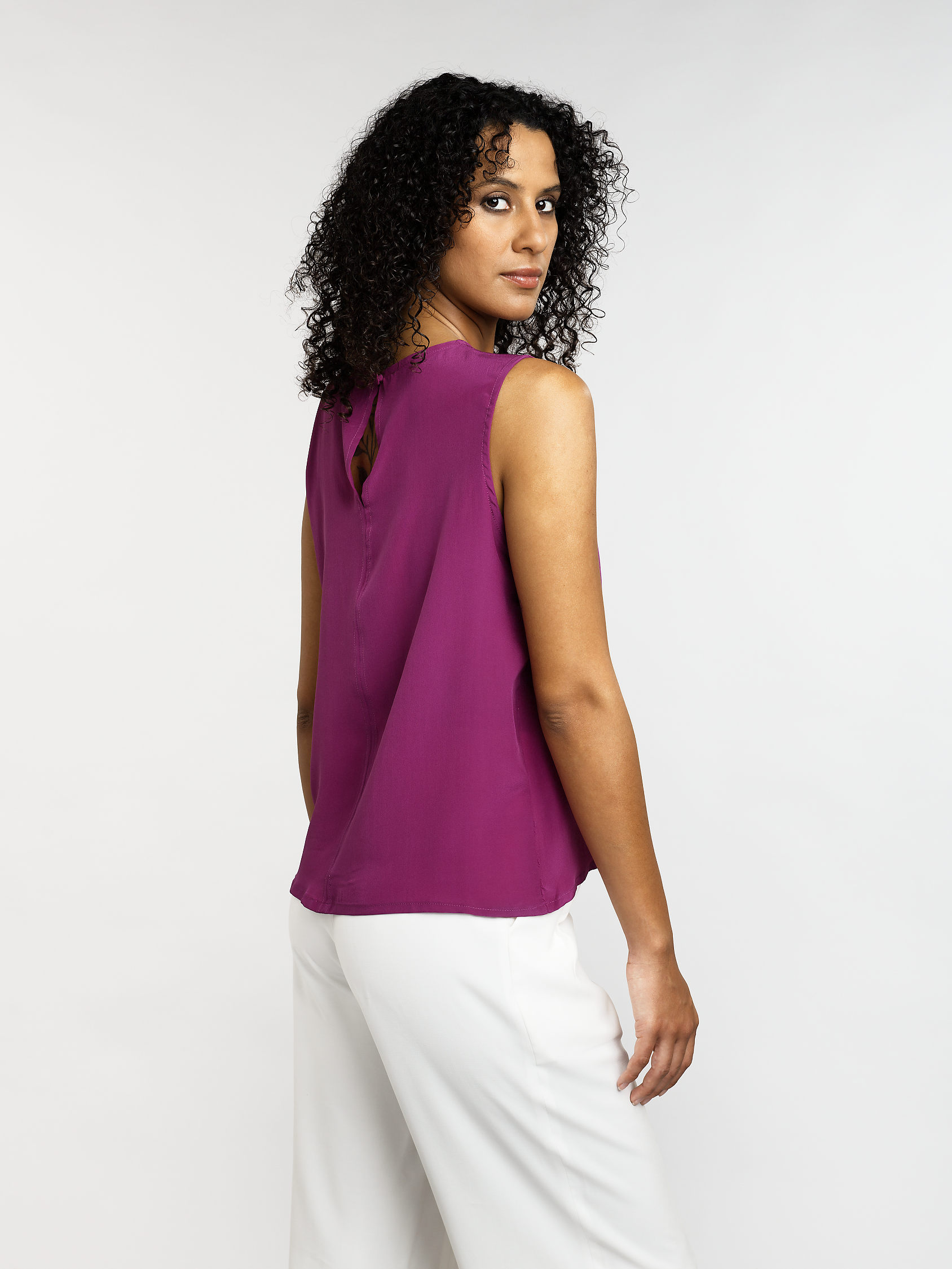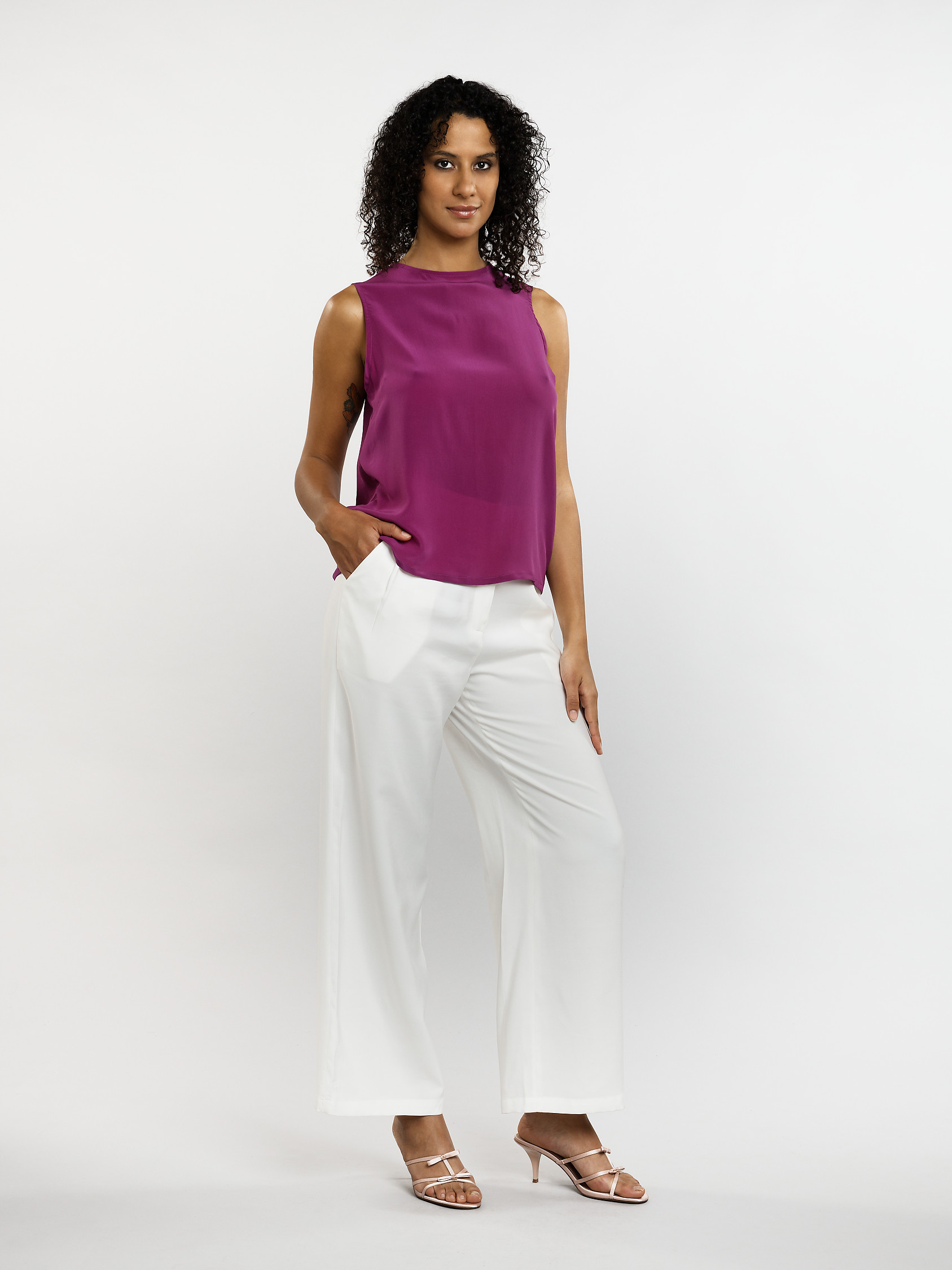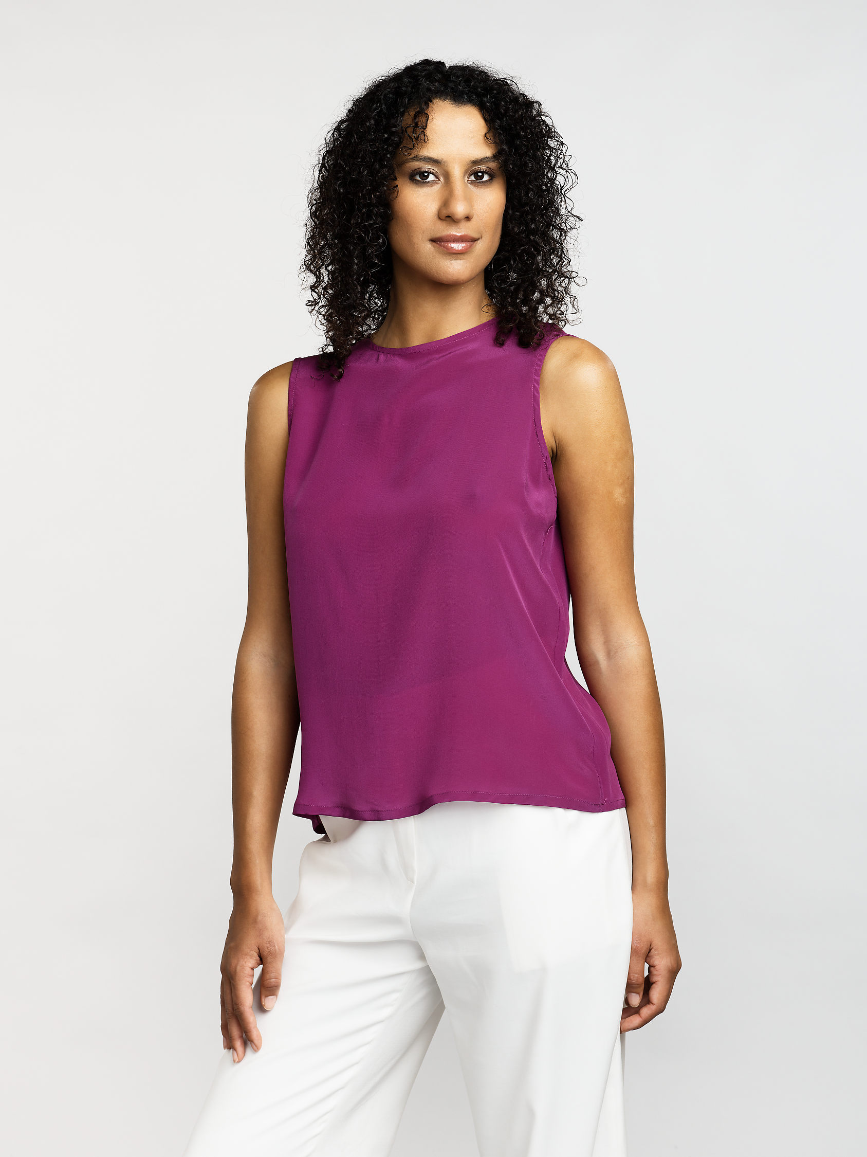 Ce débardeur en soie offre une fluidité délicate et un toucher luxueux sur la peau. Sa coupe simple et élégante met en valeur la silhouette avec subtilité. L'encolure dégagée souligne le port de tête avec grâce. C'est une pièce raffinée, essentielle pour composer des looks sophistiqués en toute simplicité.