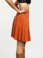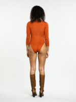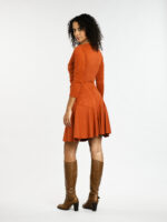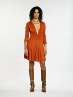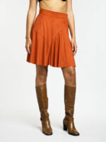 Cet ensemble en suédine couleur terre de Sienne offre un côté bohème et sensuel. Le body présente un décolleté plongeant mettant en valeur la silhouette avec une touche d'audace raffinée. La jupe courte, avec sa coupe flatteuse et son mouvement fluide, complète l'ensemble avec une légèreté irrésistible.