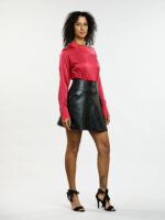Osez l'originalité avec cette mini-jupe en cuir noir, dont la fente délicate insuffle une touche avant-gardiste à votre allure. Le cuir, à la fois souple et structuré, sculpte la silhouette avec élégance. Cette pièce est idéale pour celles qui affirment leur individualité avec style et audace.