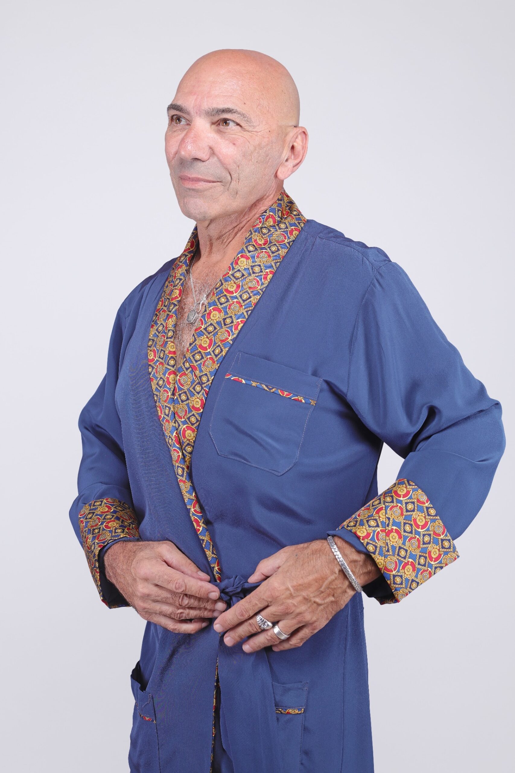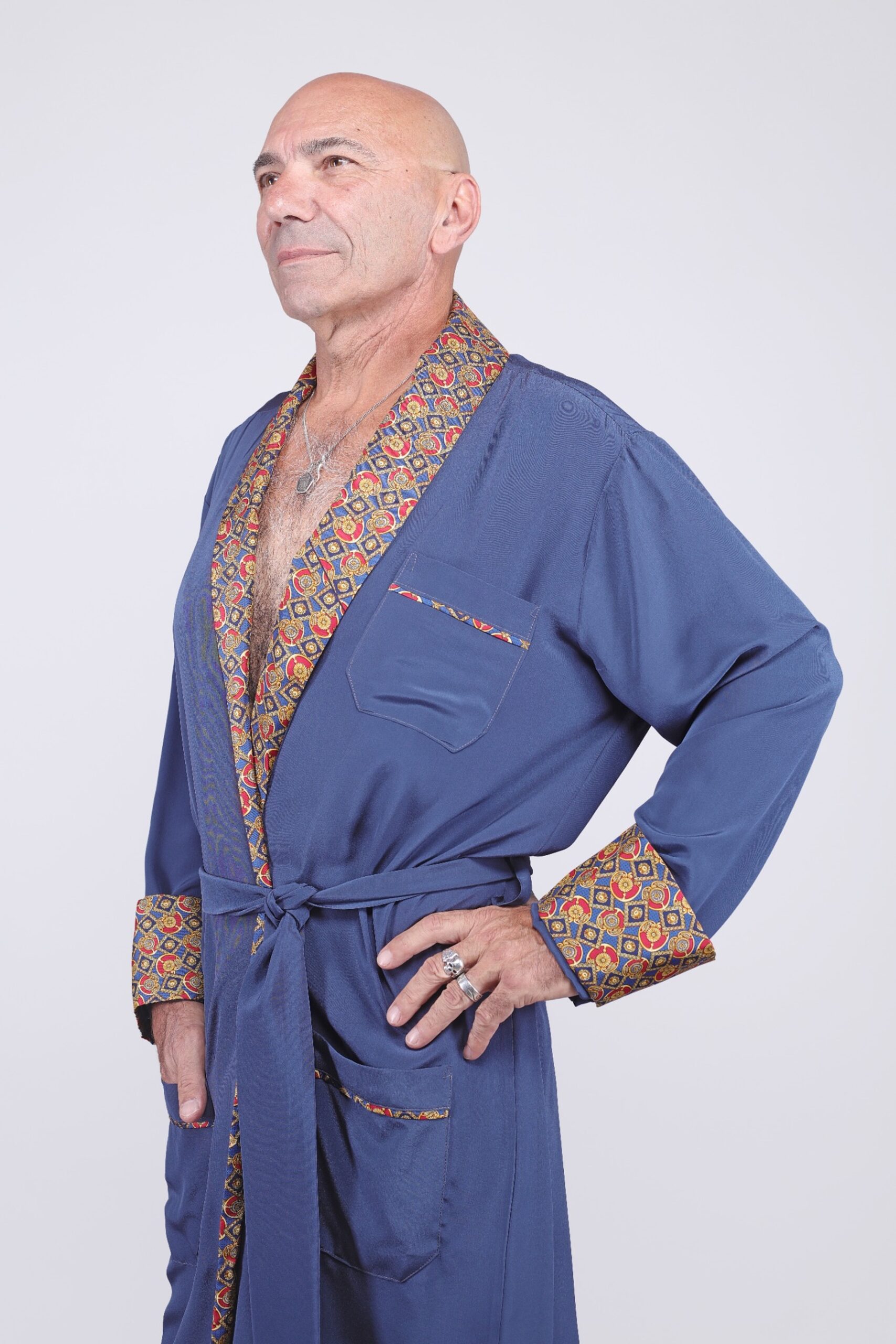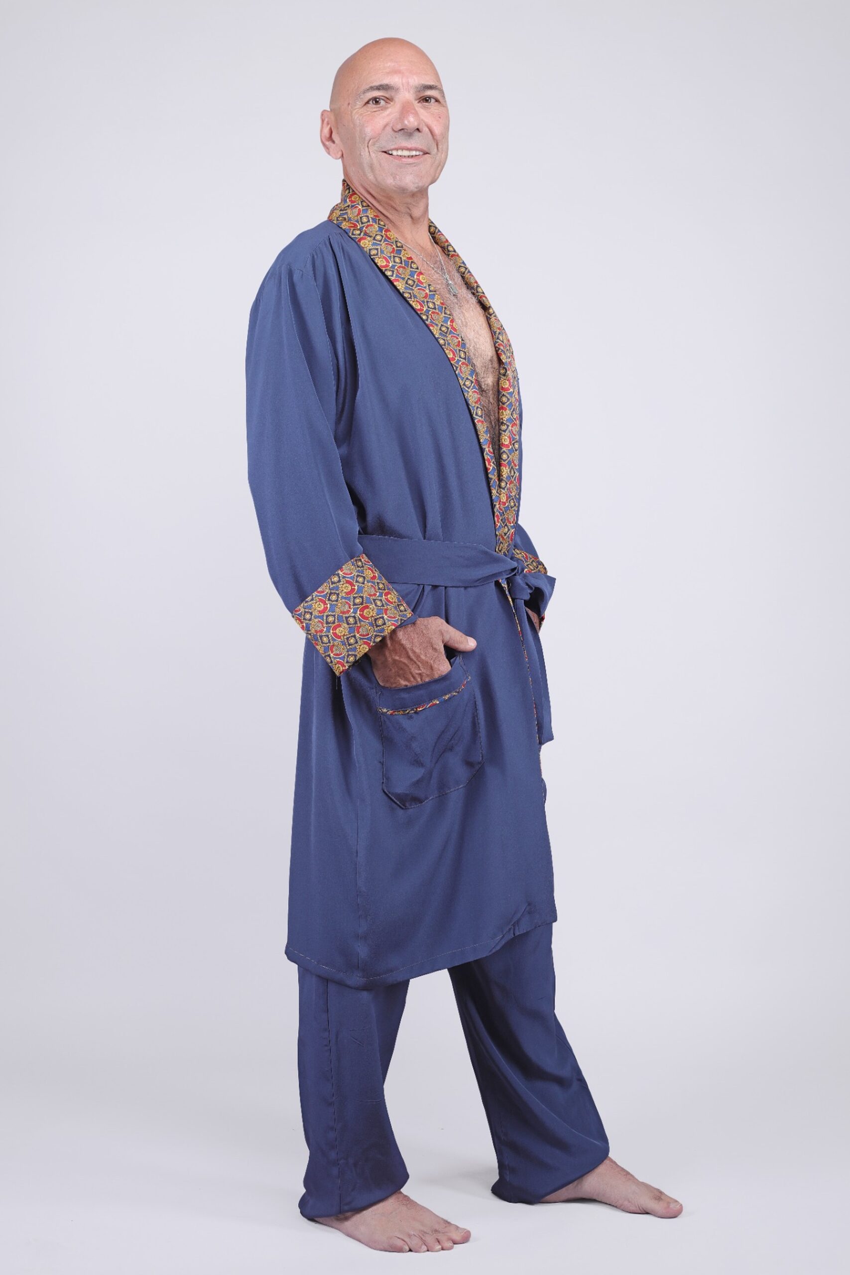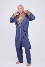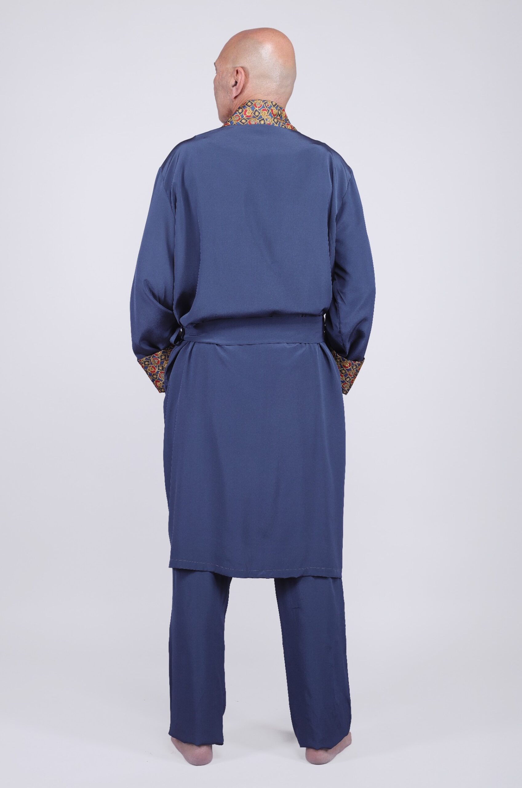 Inspiré de l’élégance intemporelle des vestes de chambre de l’époque, ce kimono pour homme en 100% soie naturelle allie confort et sophistication. La douceur fluide de la soie épouse le corps avec légèreté, auquel s’ajoute des finitions ornées d’un motif d’inspiration royale. Les contrastes du col châle, des revers de manches, et des poches évoquent l’univers des gentlemen raffinés, entre vintage et modernité. Le bleu profond du tissu principal fait ressortir avec éclat les détails soyeux et colorés, combinant prestance et vêtement de nuit.