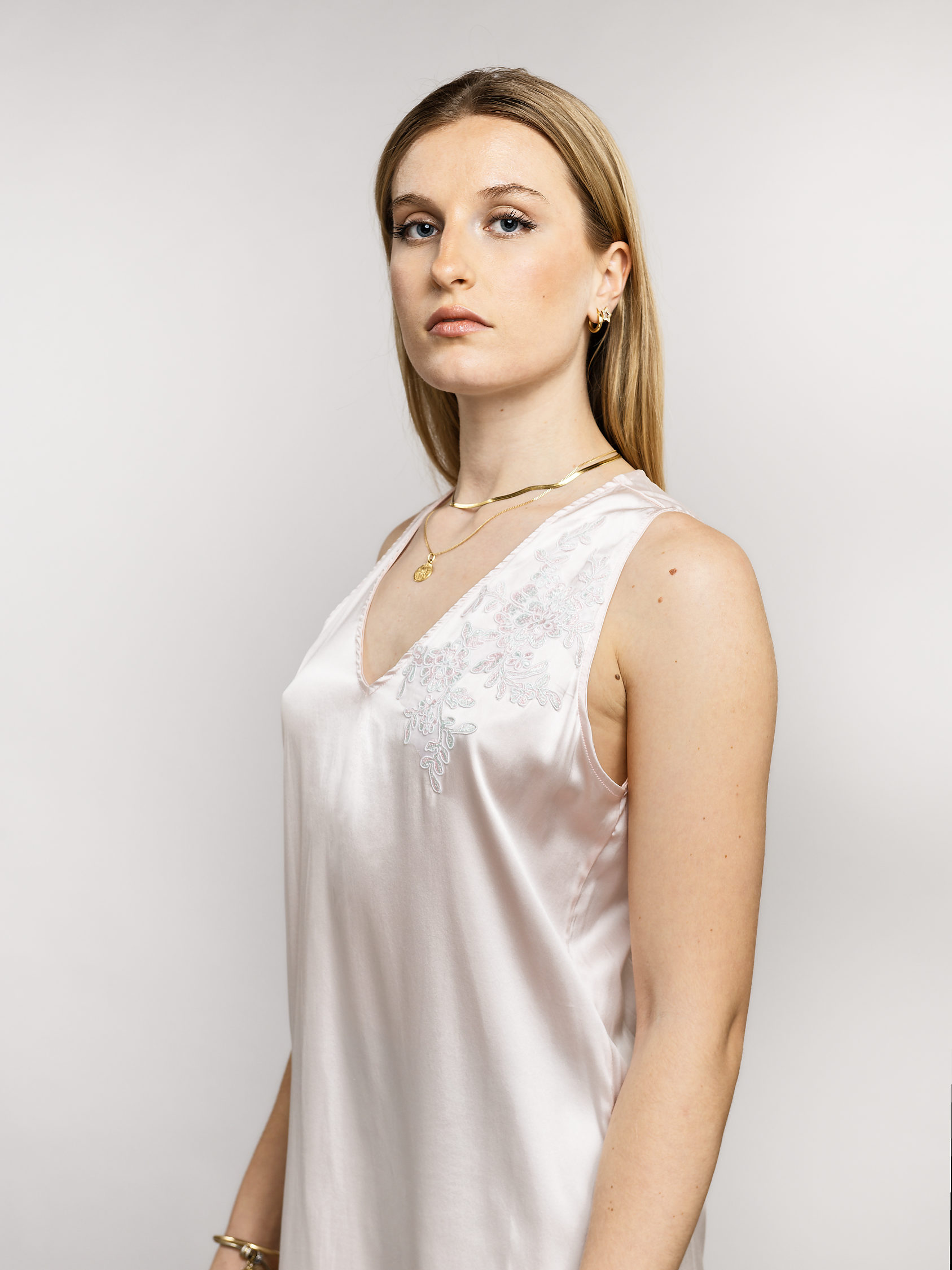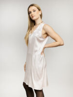 Douce et sensuelle, cette nuisette épousera votre silhouette avec sa soie irrésistible. Cette lingerie en soie agrémentée d’un sublime détail floral sur la poitrine est un subtile mélange entre délicatesse et raffinement.
