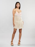 - Nœud au dos permettant d’ajuster et maintenir au mieux la poitrine
