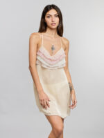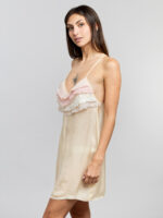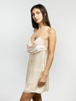 Si la sophistication était un rêve, elle prendrait la forme de la nuisette Madeleine. Cette pièce au charme singulier séduit par ses détails raffinés et son volant plissé en mousseline de soie sur le devant de la poitrine. Le dos nu, sublimé par un petit nœud, lui confère un charme irrésistible. Inspirée du vintage. Madeleine est le parfait équilibre entre héritage et modernité. Cette nuisette en soie se porte idéalement avec la robe de chambre Antoinette, pensée pour compléter ce look intemporel.
