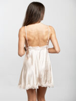 - Dentelles autour de la poitrine et à l’échancrure du dos, ainsi que sur le bas de la nuisette