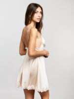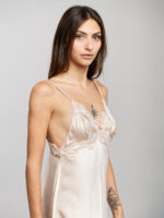 Réalisée en satin de soie brillant, cette nuisette épouse les courbes avec délicatesse, tandis que les finitions en dentelle ajoutent une touche de raffinement tout en subtilité. Son col en V et ses fentes latérales apportent une note sensuelle assumée. Idéale pour vos soirées romantiques ou pour vous sentir belle chez vous, cette nuisette en soie allie confort et séduction avec justesse.