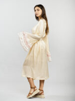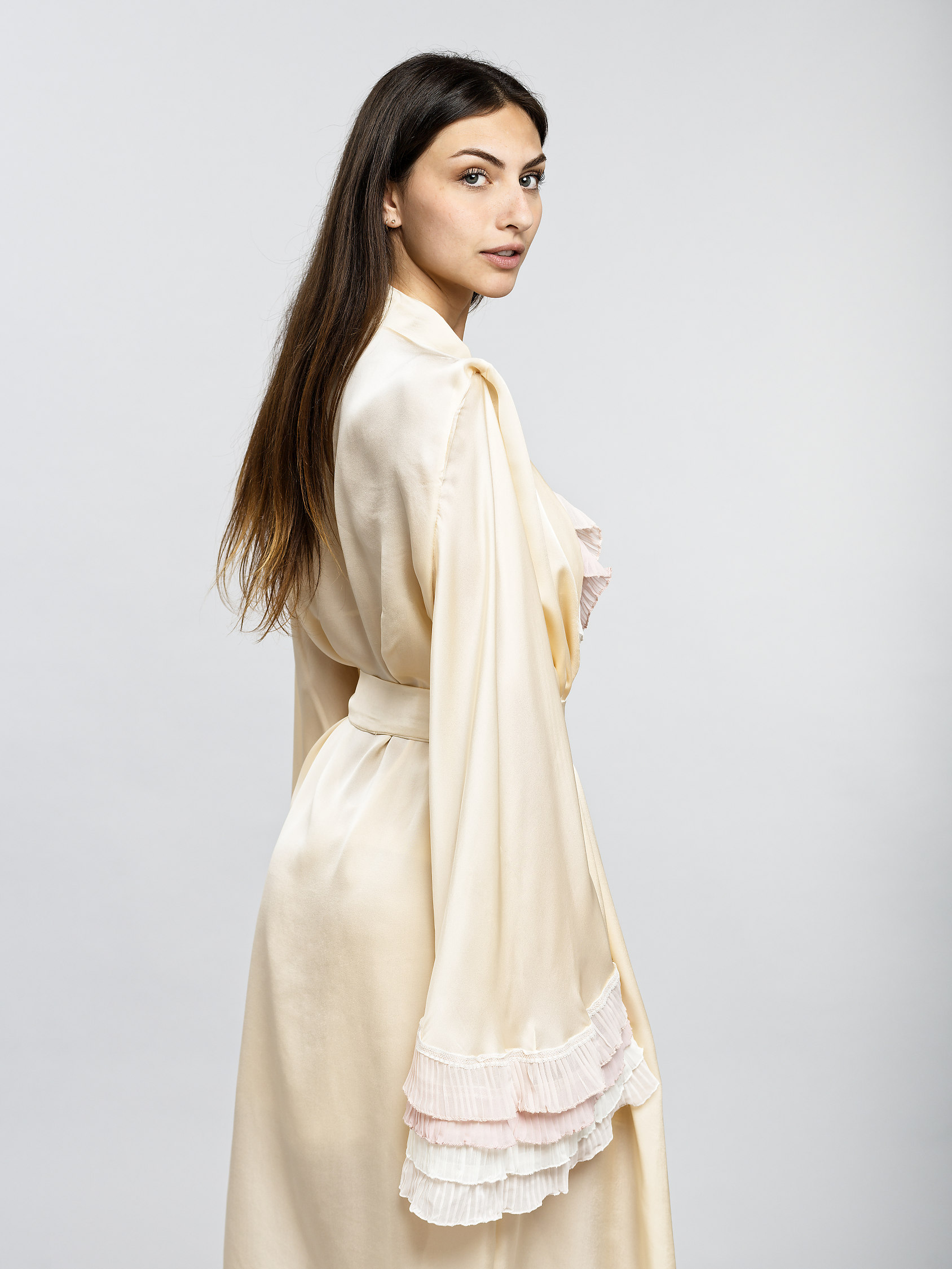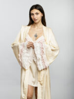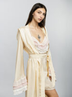 Élégance et douceur se rencontrent dans la robe de chambre Antoinette, un hommage à la féminité délicate. Confectionnée dans une soie transparente de part sa finesse, elle caresse la peau avec une légèreté presque céleste. Sa coupe fluide, ceinturée à la taille, sublime la silhouette tout en douceur. Les manches longues, subtilement évasées, sont ornées de volants plissés en mousseline aux teintes pastel. Un jeu de transparence et de mouvement qui évoque les ballets d’antan. Une pièce précieuse, pensée comme une ode aux matins lents et aux soirées empreintes de charme