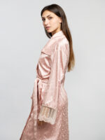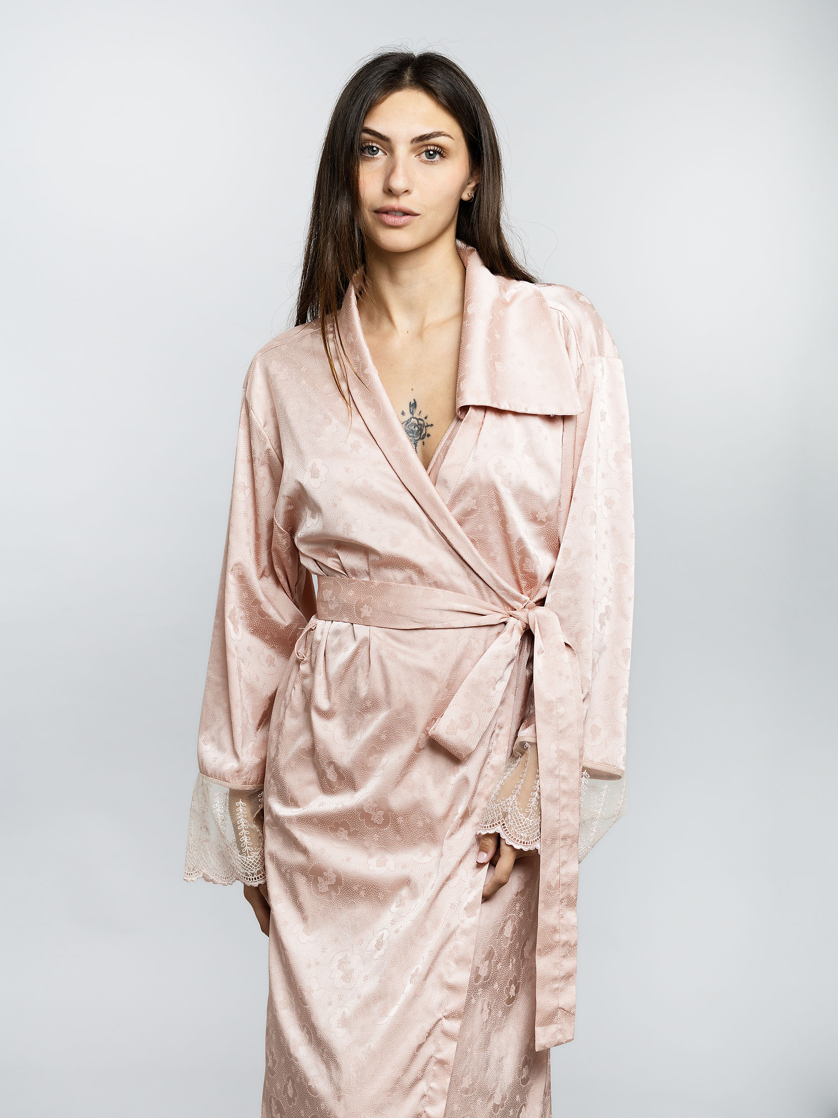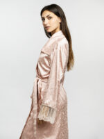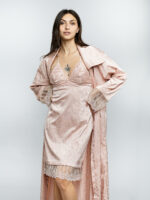 Si vous recherchez un style épuré et doux, la robe de chambre Fleurine est le parfait compromis entre délicatesse et minutie. Confectionnée en jacquard de soie, elle est agrémentée de tulle brodé et transparent aux bas des manches et d’un col asymétrique qui lui confère une allure unique. Sa douceur vous assure un confort optimal et sublimera vos looks nocturnes avec raffinement.