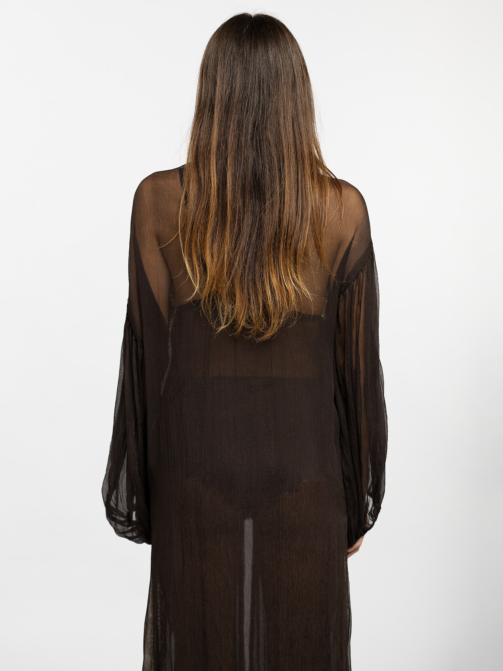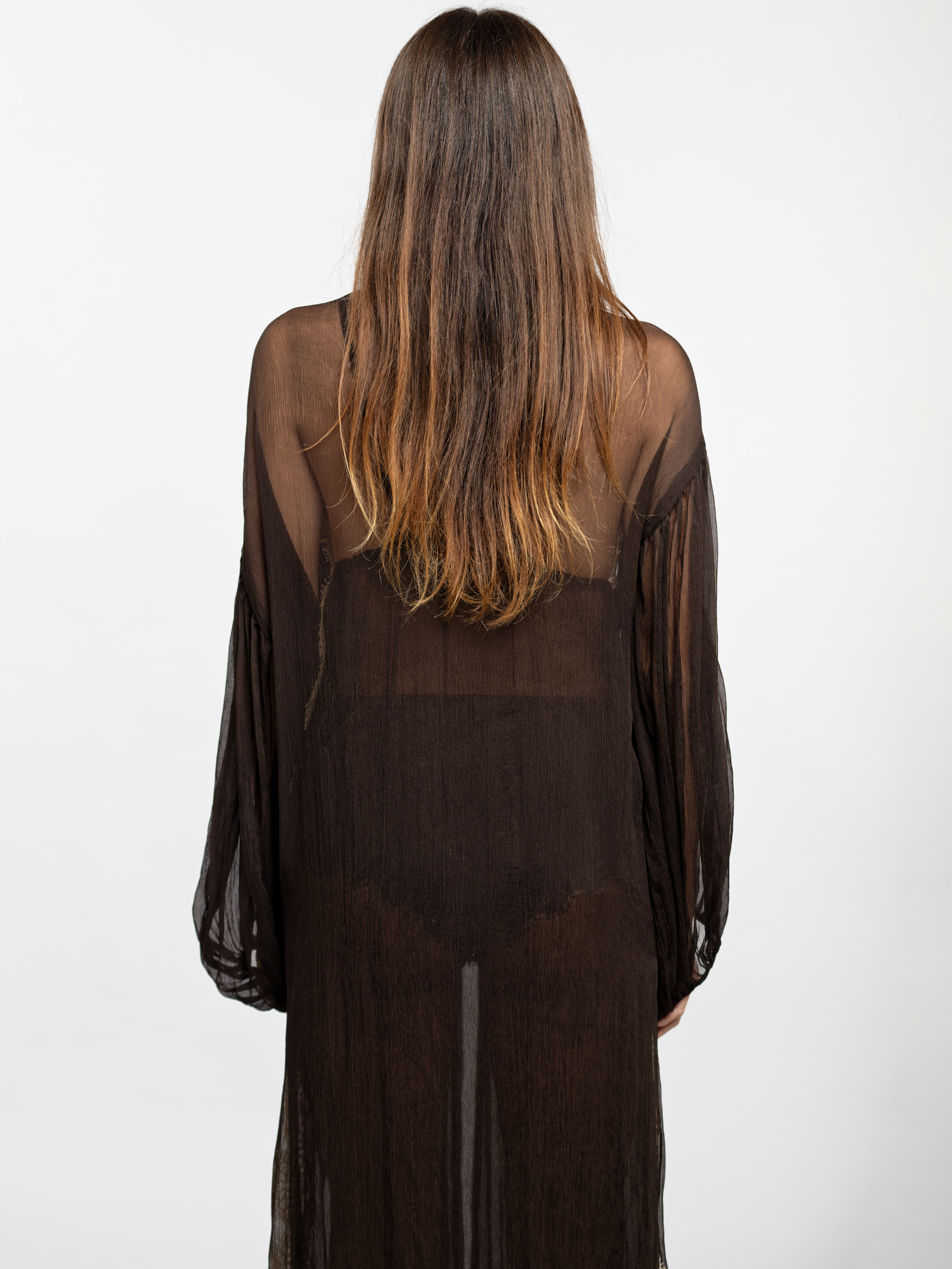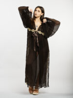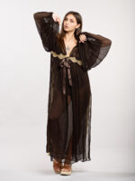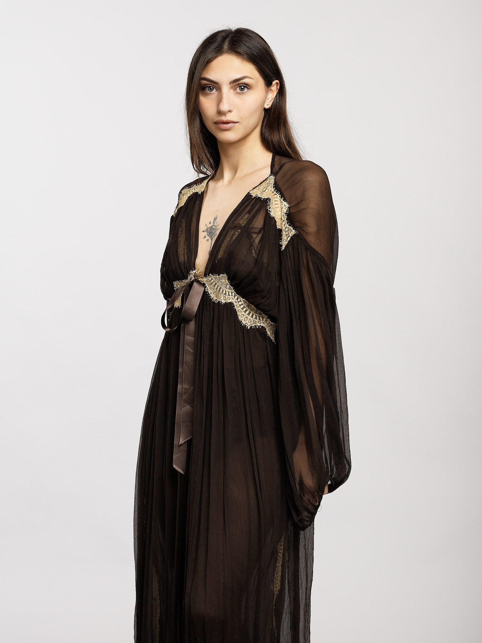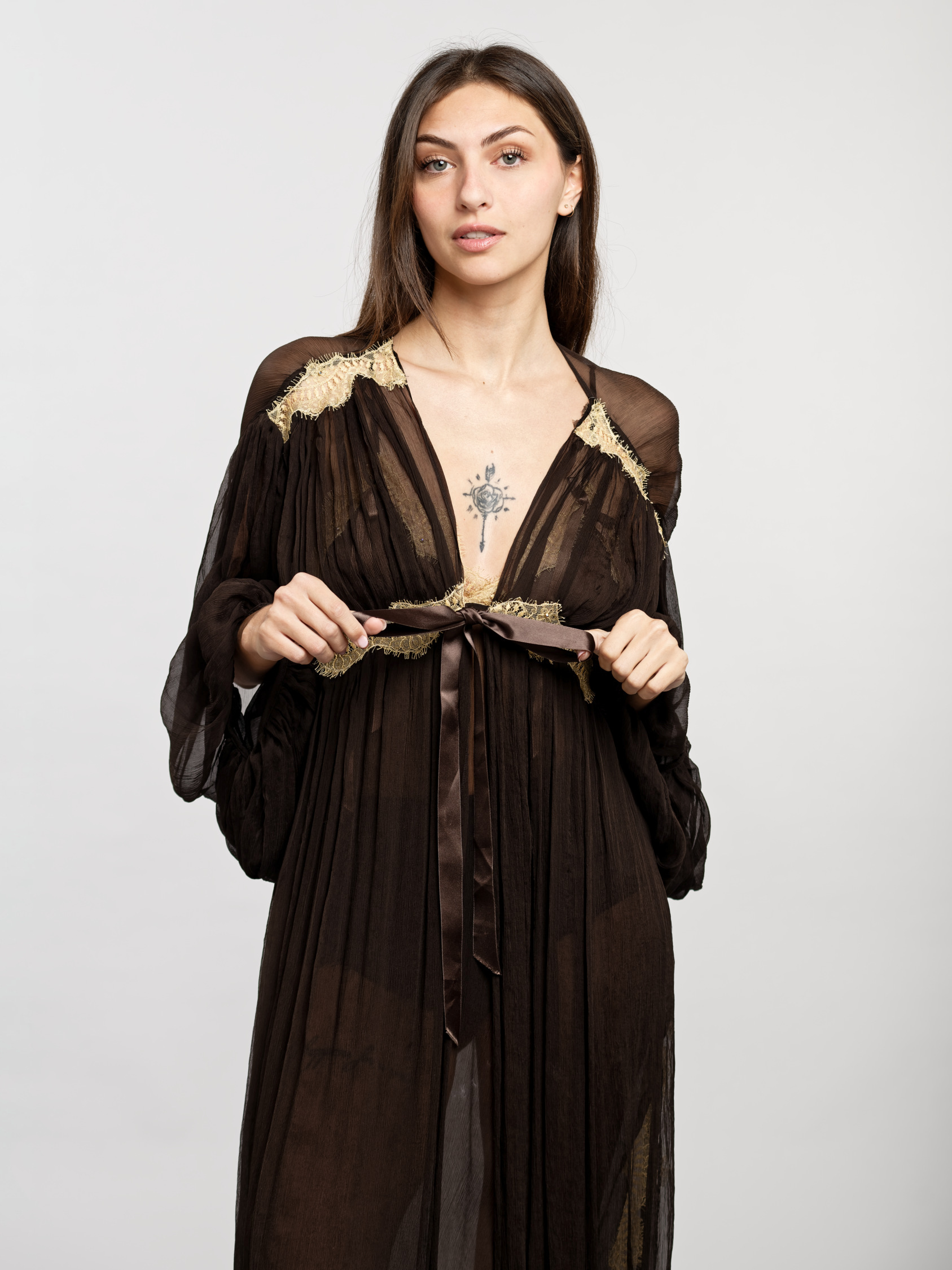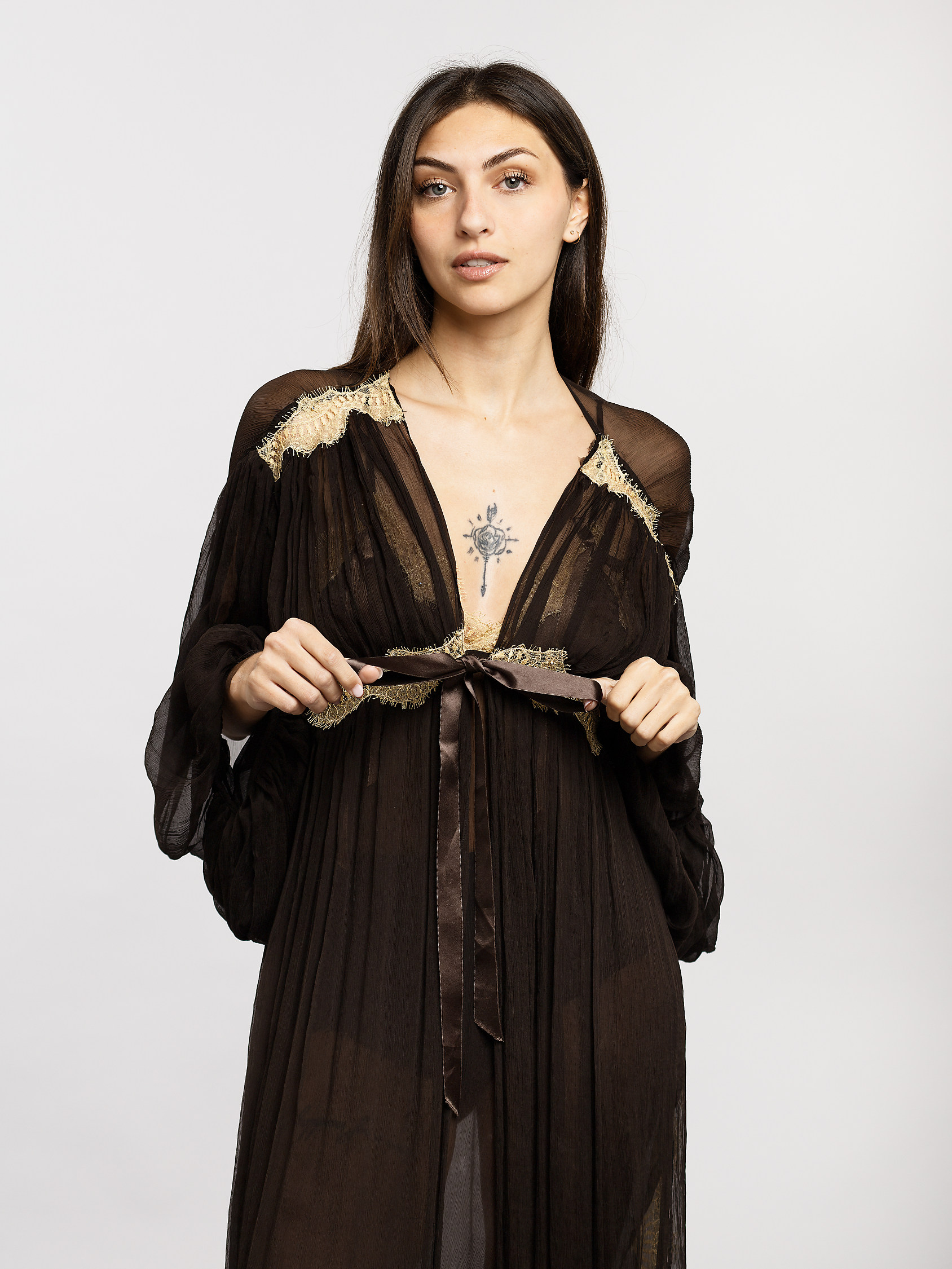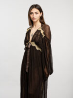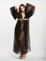 Grâce à sa matière en mousseline de soie, cette robe de chambre vous offrira raffinement et sensualité. La transparence et les nombreux détails décorant le vêtement font écho à un autre siècle et ravivent chez la femme moderne l’esthétisme d’antan. L’aspect luxueux de cette pièce est apporté par la confection d’éléments dorés en dentelle de Calais, ornant les épaules et recouvrant délicatement le dessous de la poitrine. De petits strass sont présent sur ces mêmes détails et confèrent toute l’originalité de cette robe de chambre donnant l’effet d’un bijou.