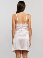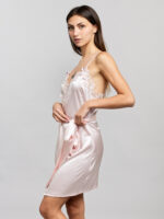Cette pièce de lingerie, réalisée en soie satinée, est une nuisette portefeuille facile à enfiler grâce à sa ceinture nouée à la taille. Elle offre une touche d’élégance et de raffinement. Façonnée avec soin, cette nuisette en soie est délicatement surmontée de dentelle de Calais.