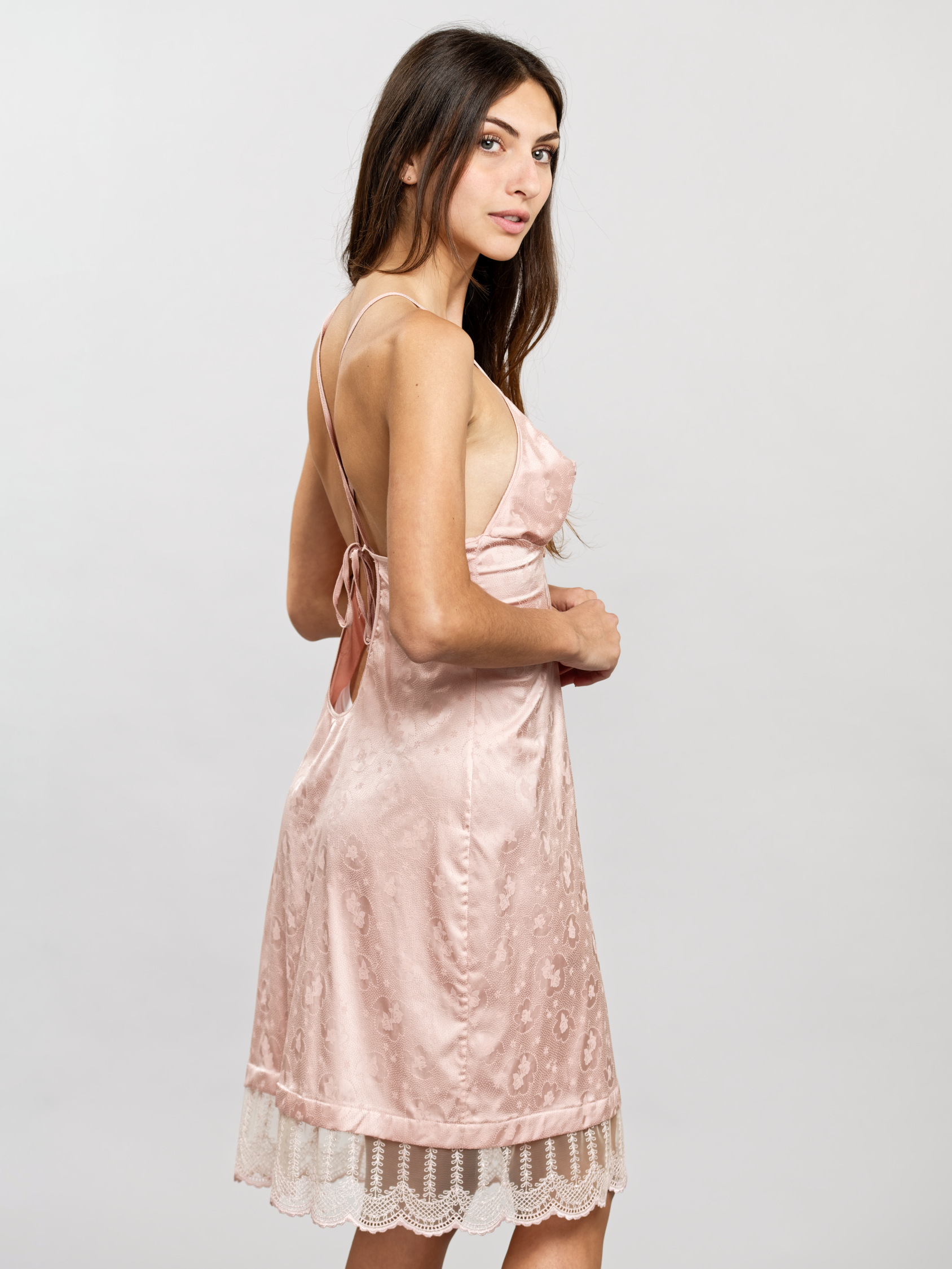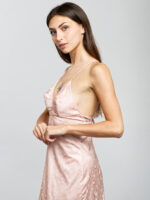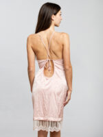 - Dos nu orné avec des bretelles croisées pour avoir un maintien idéal de la poitrine et serrage avec un nœud pour un marquage élégant à la taille