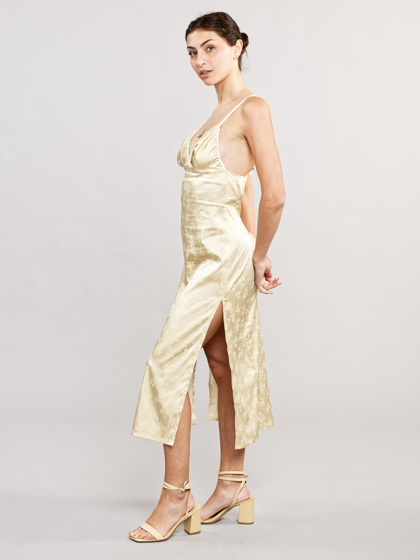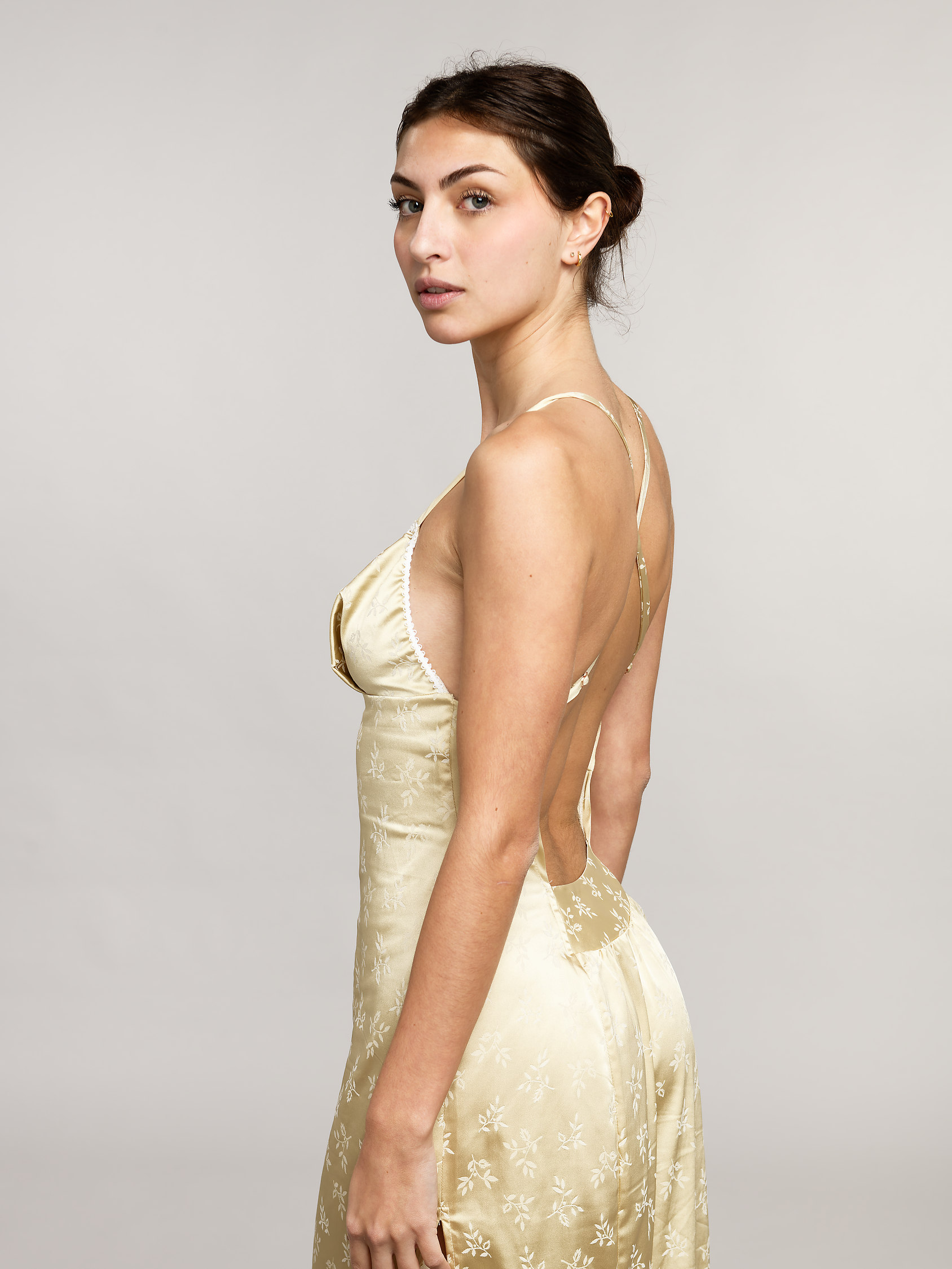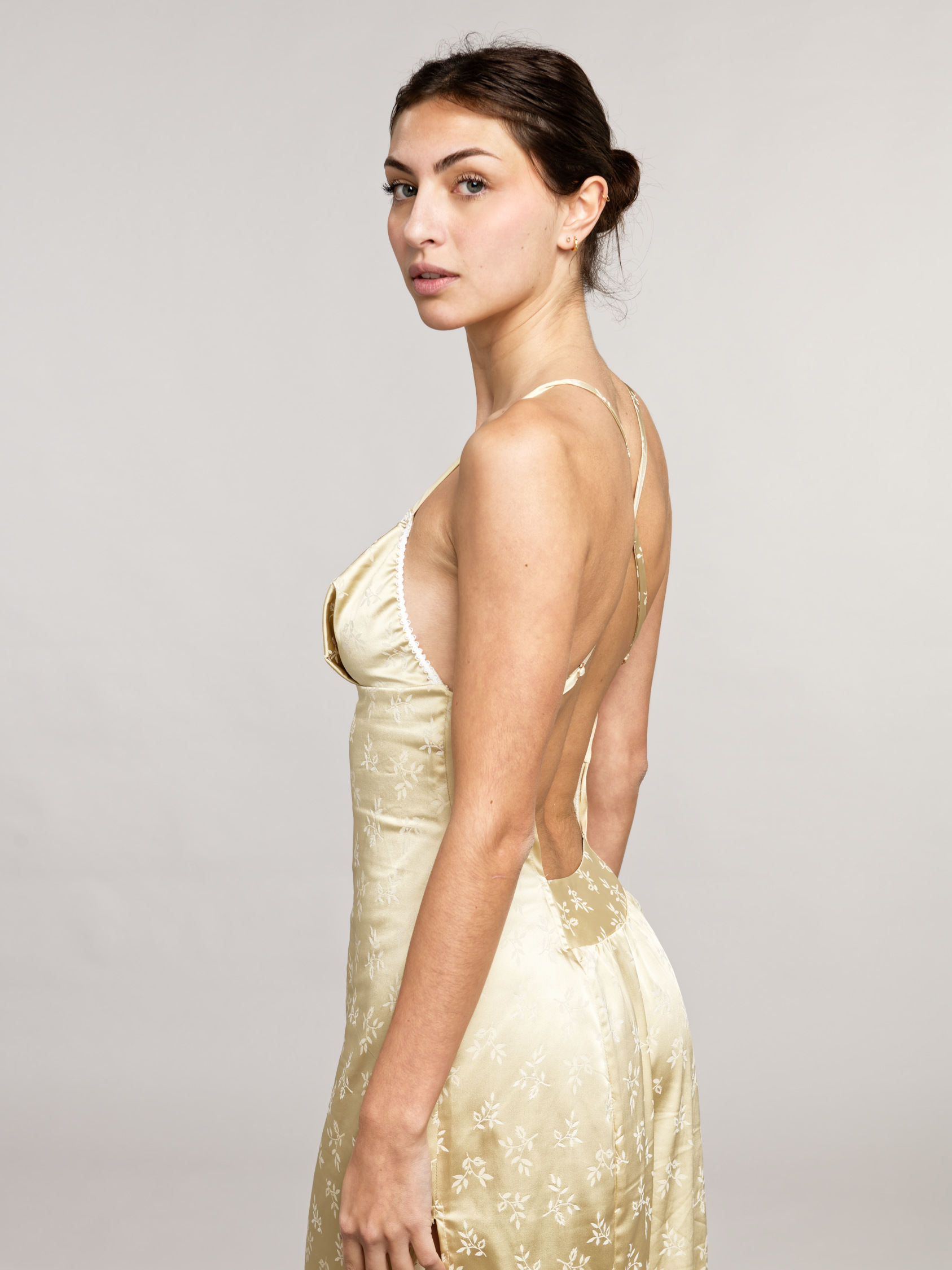 Le jacquard de soie sublime l’allure de cette nuisette unique, dont la singularité évoque une inspiration japonisante.