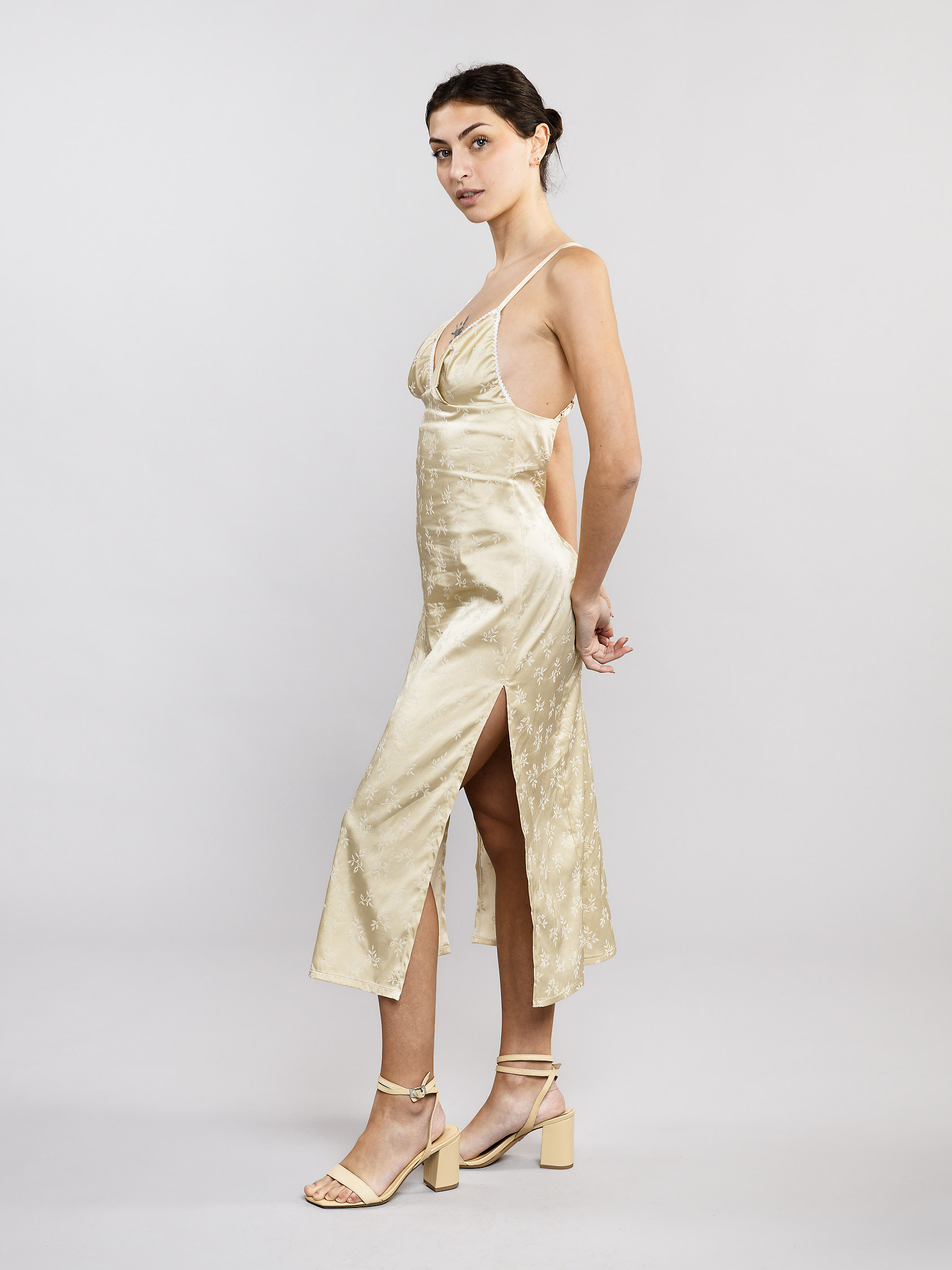 La longueur du vêtement met en beauté la silhouette et dévoile les jambes grâce à une ouverture sur les deux côtés.