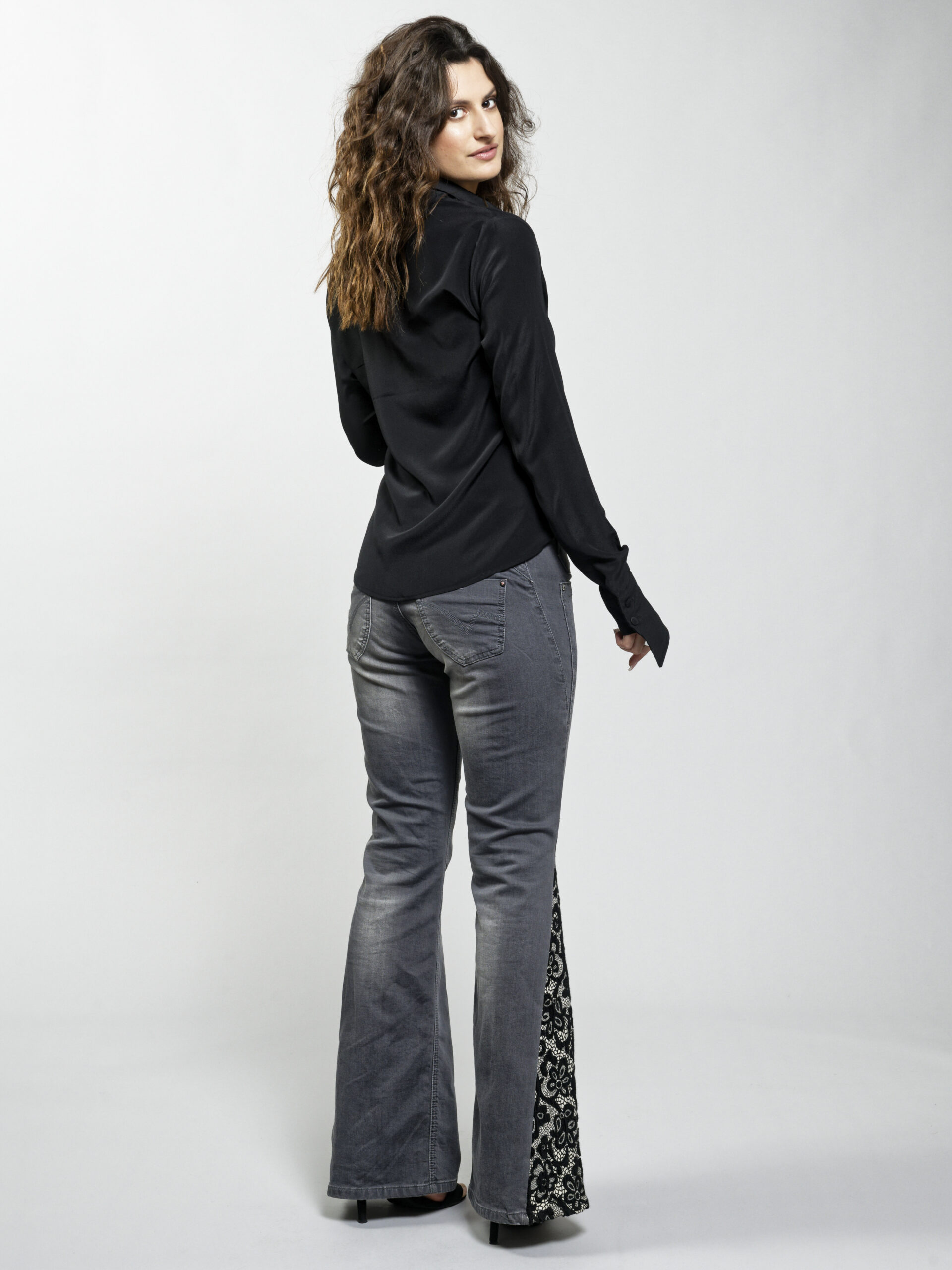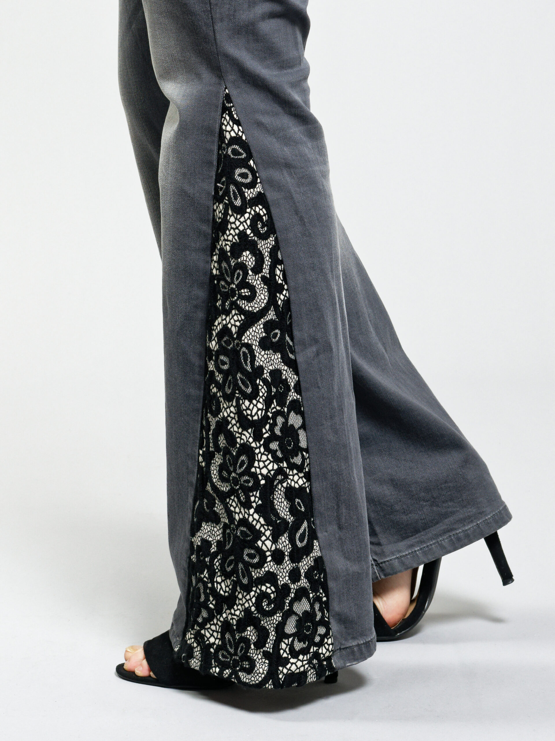 Jean évasé gris avec empiècement en dentelle noire pièce unique
