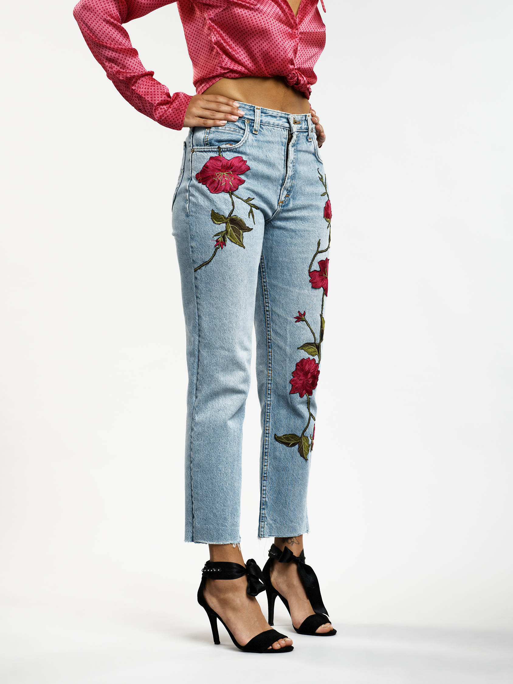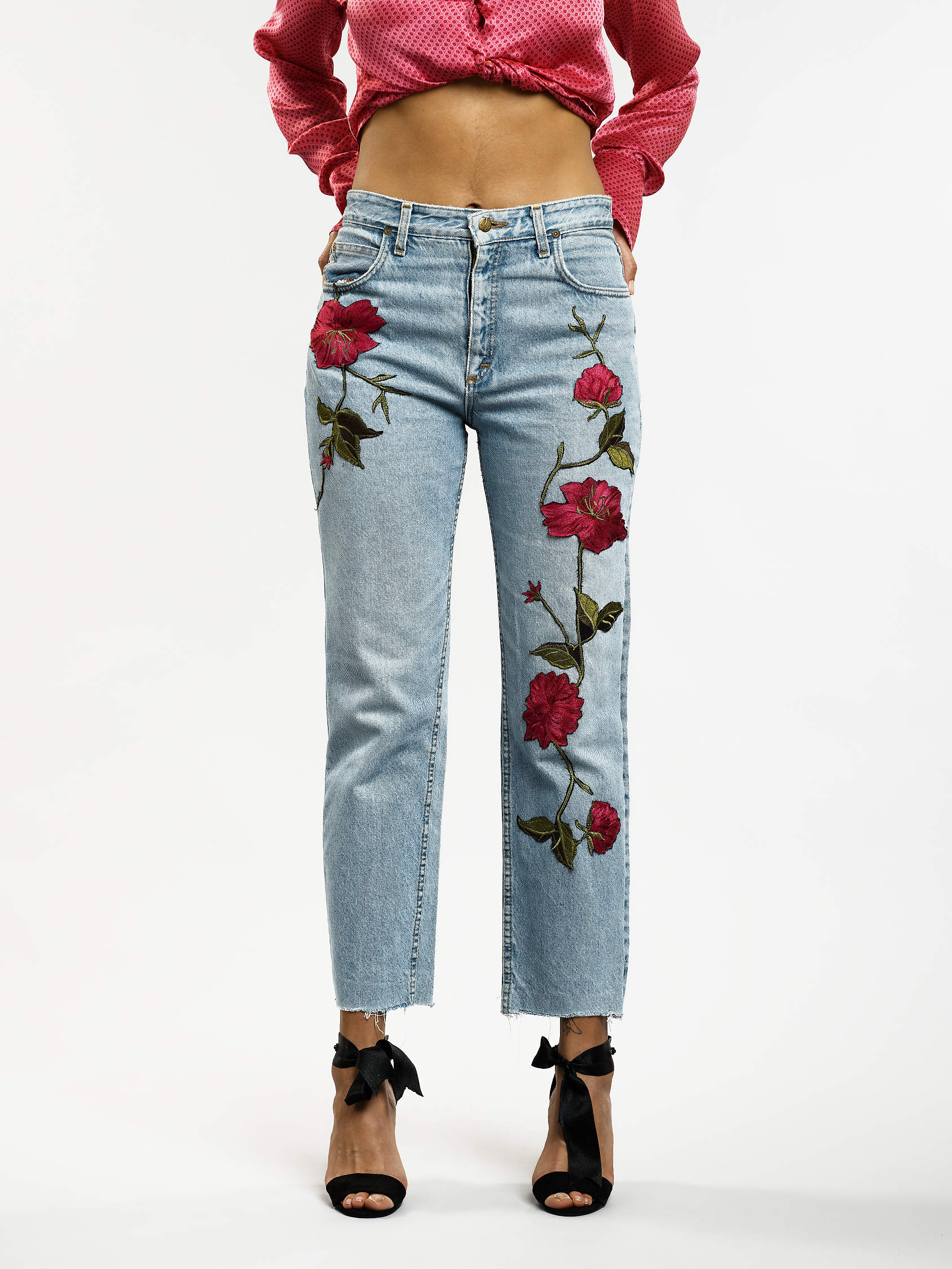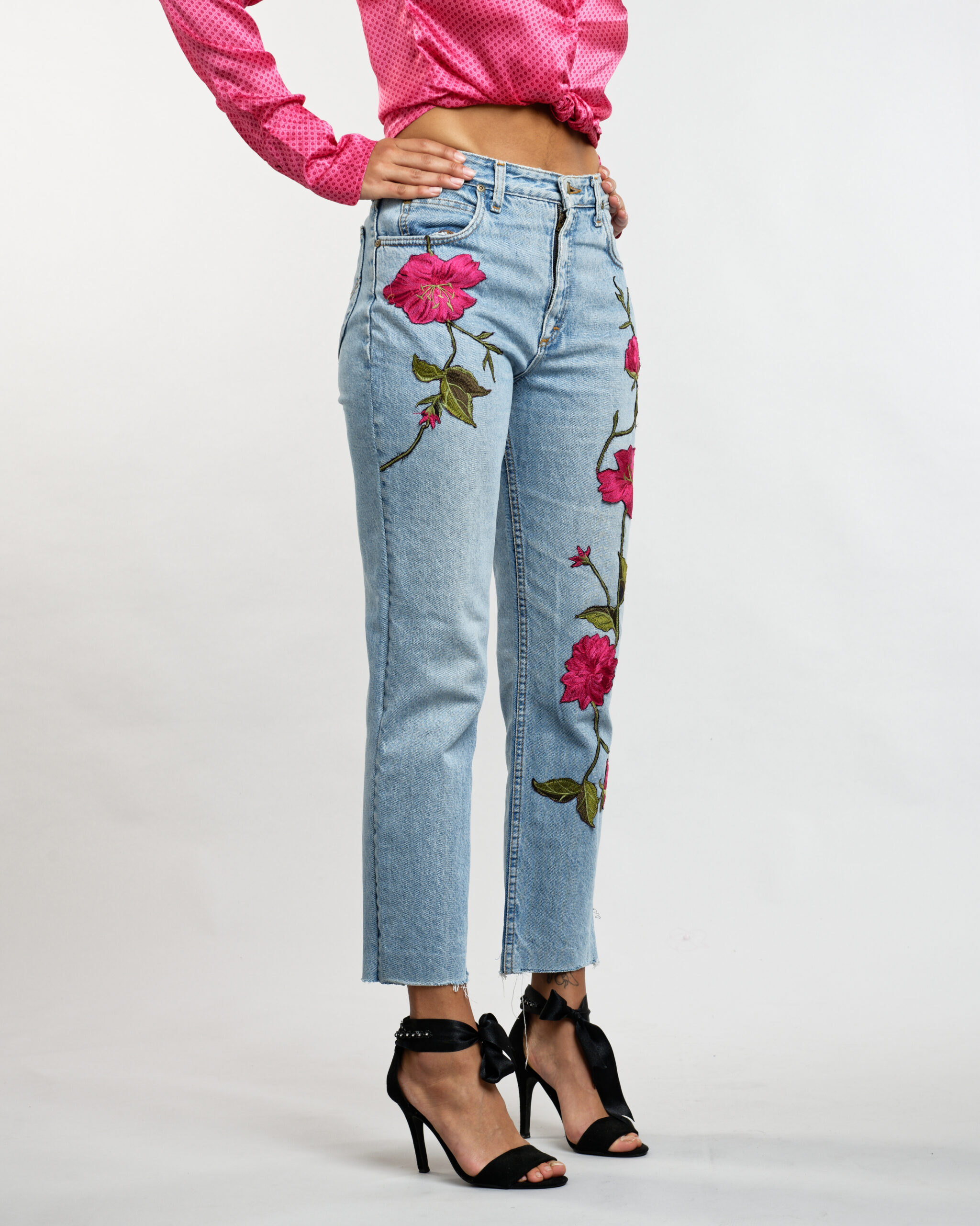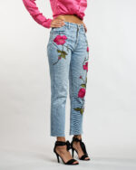 Cette pièce unique est un jean à l’allure classique se distingue par une broderie florale sur l’avant, représentant un rosier semblant grimper avec audace. Une pièce unique qui apporte à votre style une touche florale et piquante. Elle se mariera parfaitement avec une chemise ou un top afin de mettre en avant votre côté ardent.