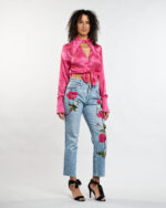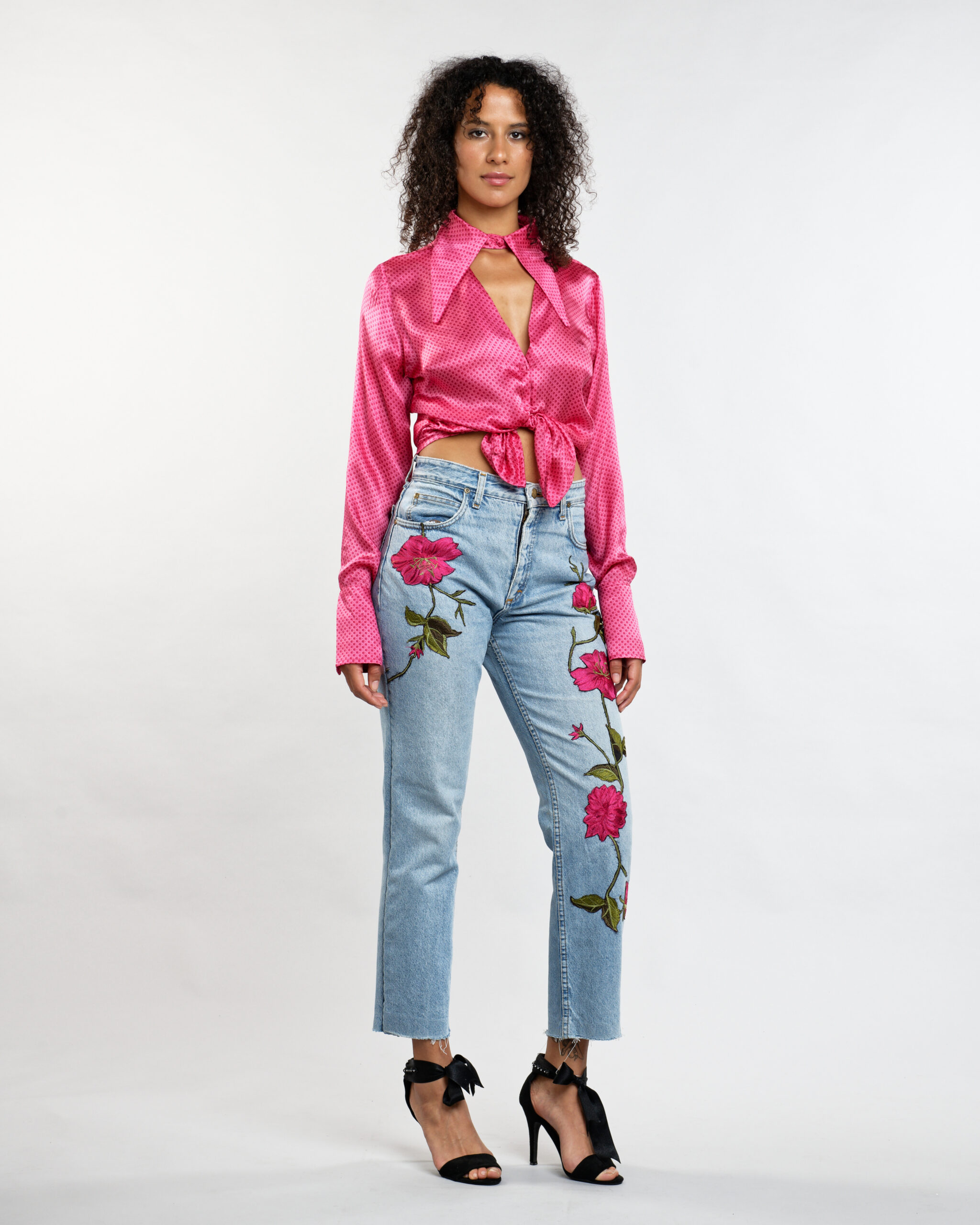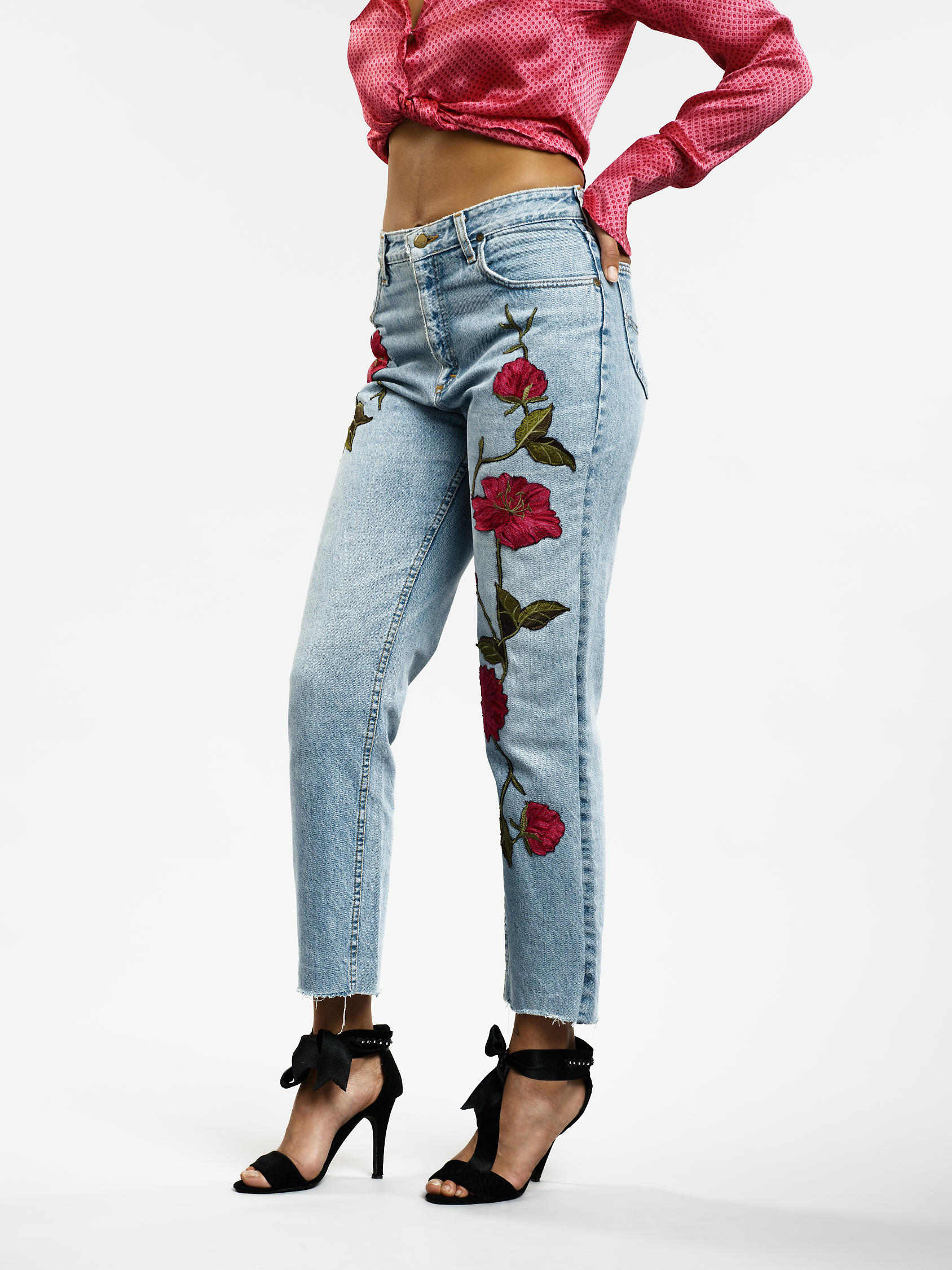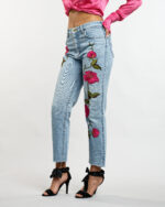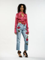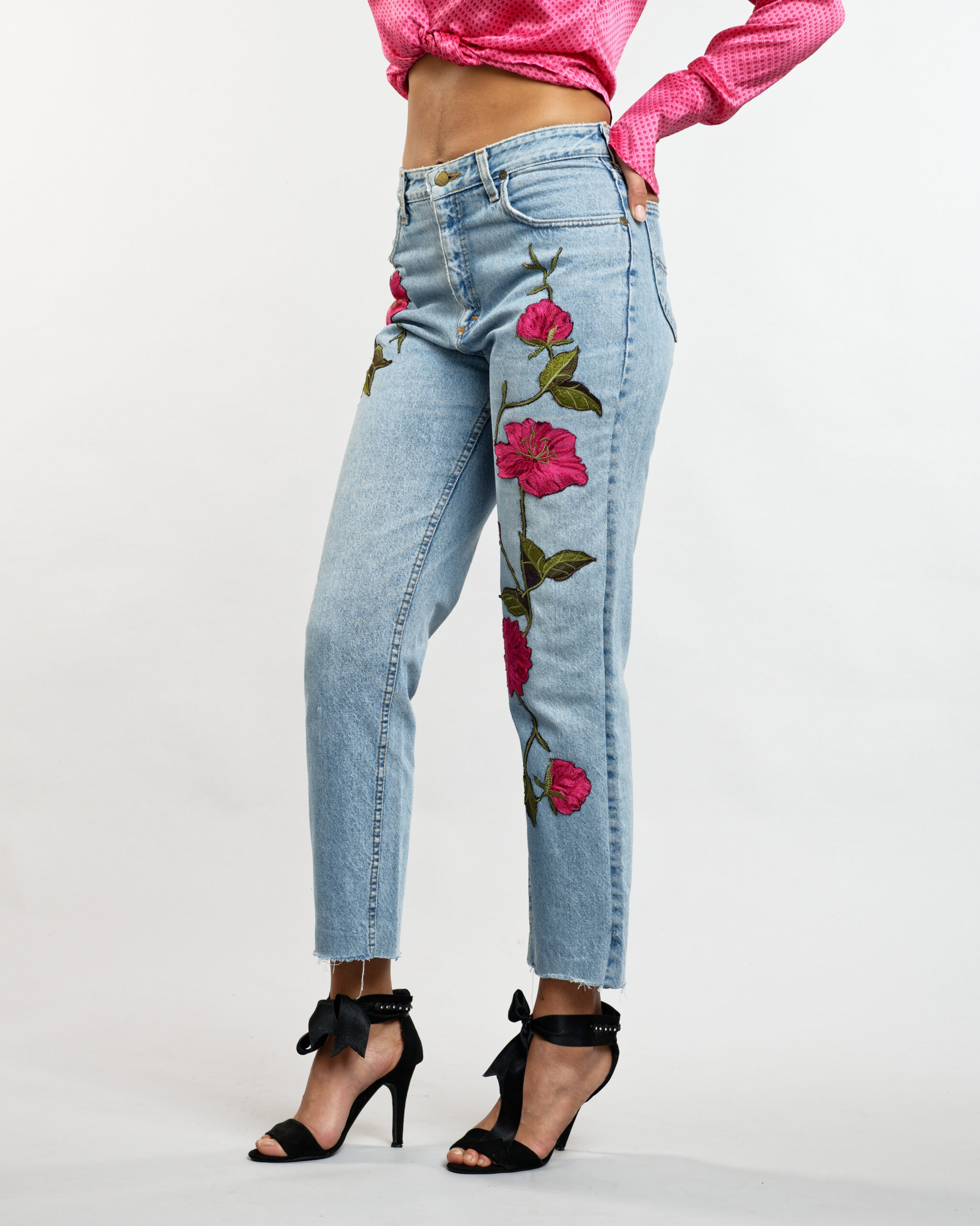 Cette pièce unique est un jean à l’allure classique se distingue par une broderie florale sur l’avant, représentant un rosier semblant grimper avec audace. Une pièce unique qui apporte à votre style une touche florale et piquante. Elle se mariera parfaitement avec une chemise ou un top afin de mettre en avant votre côté ardent.